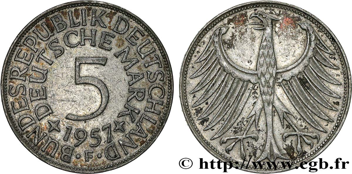Titulature avers : BUNDESREPUPLIK DEUTSCHLAND // DEUTSCHE MARK // 5 / 1957 / F.