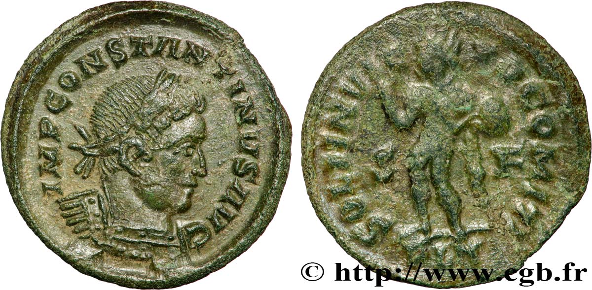 Description avers : Buste lauré et cuirassé de Constantin à droite, vu de trois quarts en avant (B*).